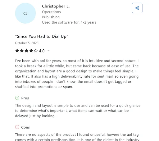 Christopher L., a long-time AOL Mail user, gave 4\5 stars and shared that the platform feels intuitive and easy to navigate.