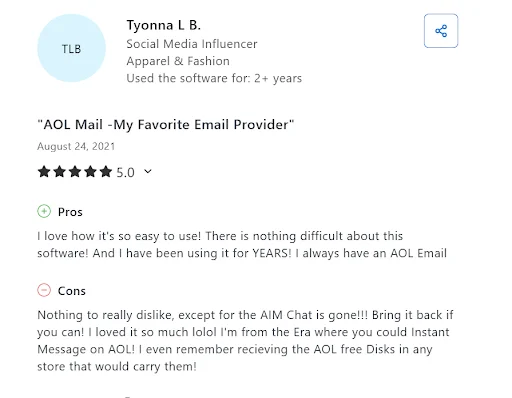 Tyonna has been a loyal AOL Mail user for years and praises it for being simple, reliable, and easy to use. She gave 5\5 stars on Capterra.