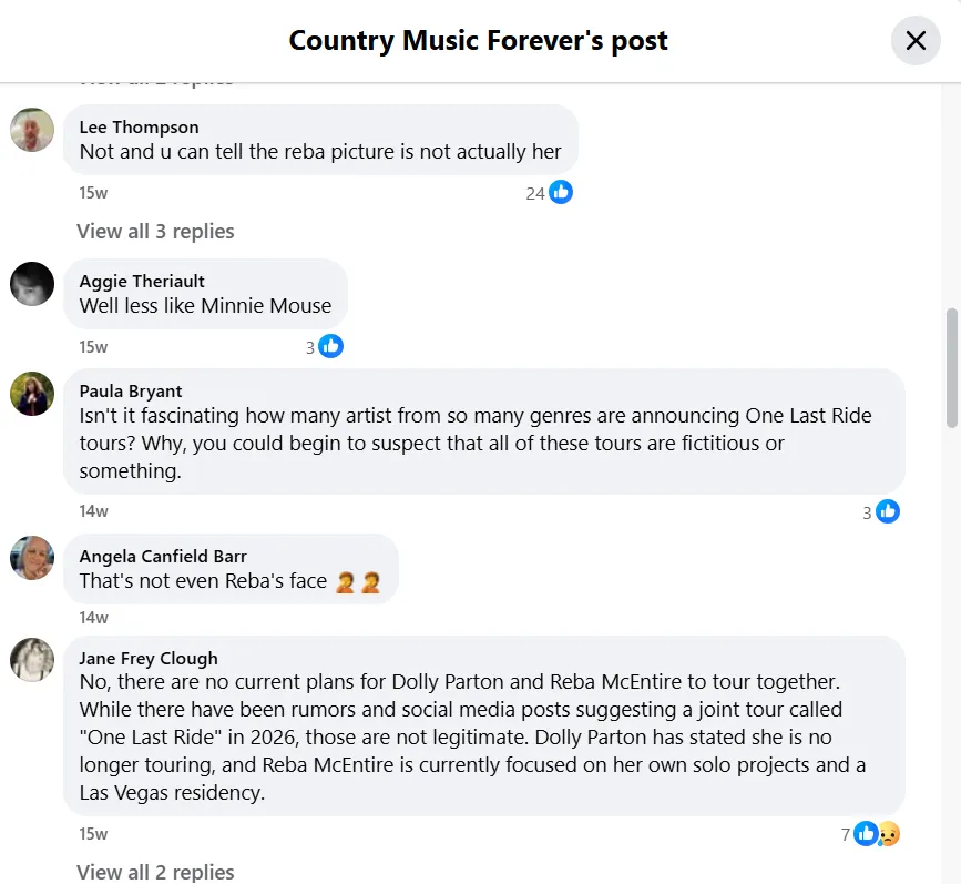 The post was titled as follows: Dolly Parton and Reba McEntire Announce 2026 Tour, One Last Ride, Once-in-a-Lifetime Revival Fans Have Waited. This fake announcement started circulating on social media in August 2025.