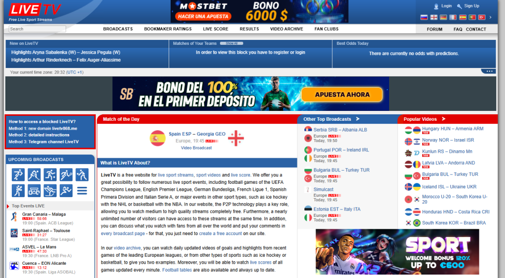 LiveTV.sx | Global tournaments, national leagues | Multilingual coverage, live scoreboards | Medium | All browsers |
