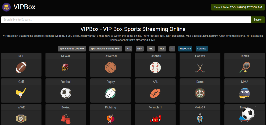 VIPBoxTV provides free streams for over 30 different sports, including football, rugby, badminton, and motor racing. The platform allows viewers to select time zones and match types, which simplifies finding ongoing games. VIPBoxTV is widely used for its global coverage and user-friendly design, although it includes moderate advertising.