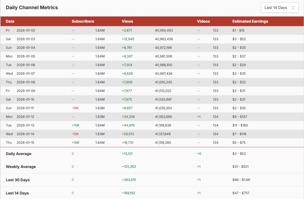 | Video Monetization | YouTube | 1.84M subscribers, 41M+ views | 133 videos | $98 – $1,600 (Last 30 Days) |
