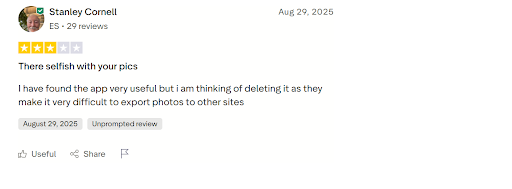Stanley Cornell finds the application helpful. But he also faces some issues regarding the export of pictures.