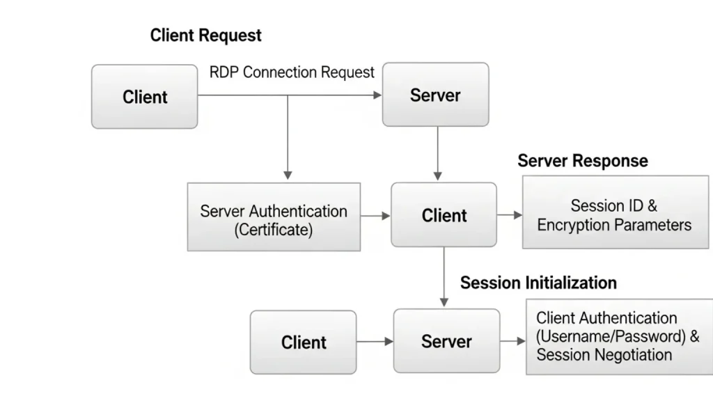 The communication starts when a client sends a request through port 3389. The data travels using TCP/IP. RDP encrypts this data to keep it private. The communication process consists of three main steps.