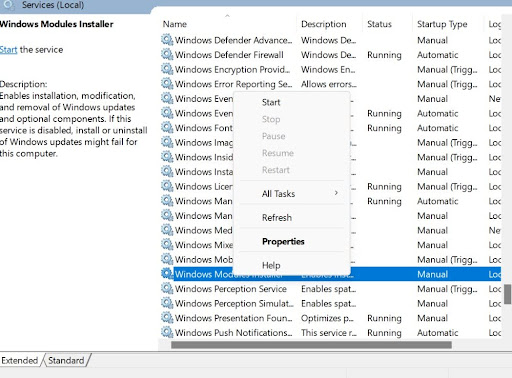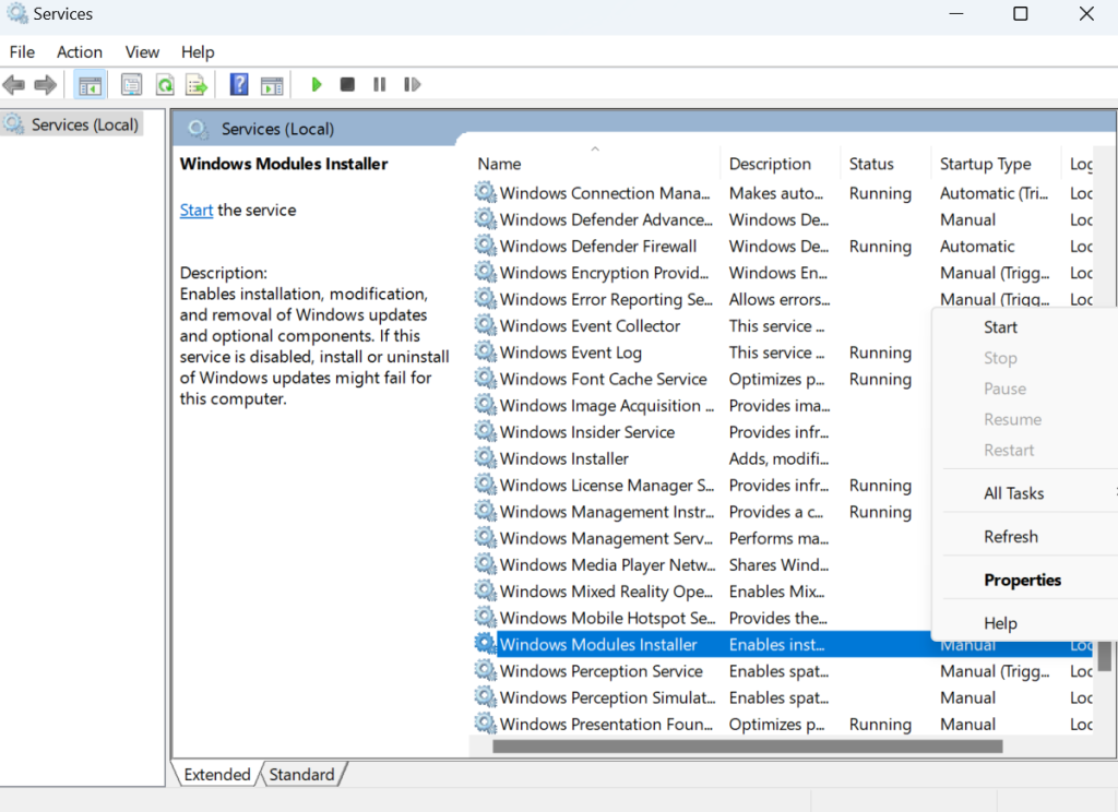 2. In the list of services, locate Windows Modules Installer and right-click it. Select Properties from the menu.