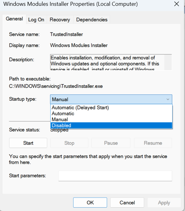 This change ensures the Windows Modules Installer Worker service only runs when needed. It prevents the process from starting automatically every time you boot your PC.